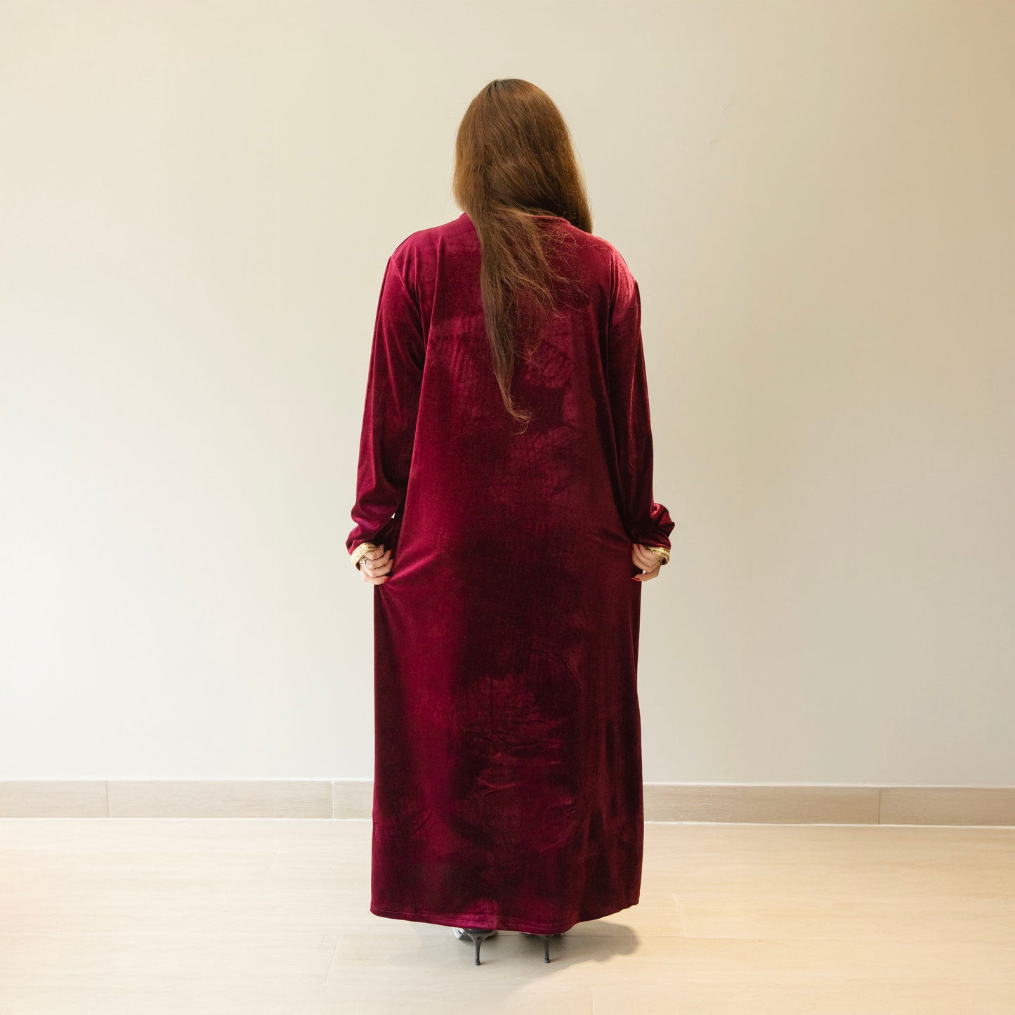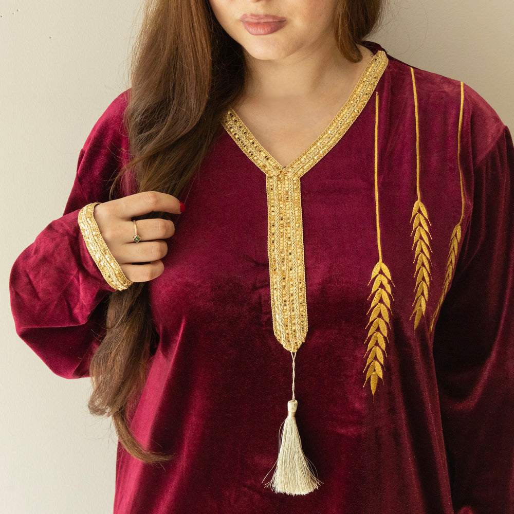 Linelle Ladies Winter Jalabiya – Maroon Velvet Look with Full Sleeves, Golden Detail,